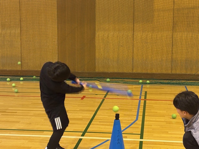 北翔大野球部渡部監督が講師で、子どもたちのサポートは札幌学生野球、大学準硬式、専門学校の3連盟の学生約40名の学生でした。子どもたちは、学生からボールの投げ方、キャッチボール、テニスラケットを使った打ち方について、細かい指導を受け、うまくなりました。