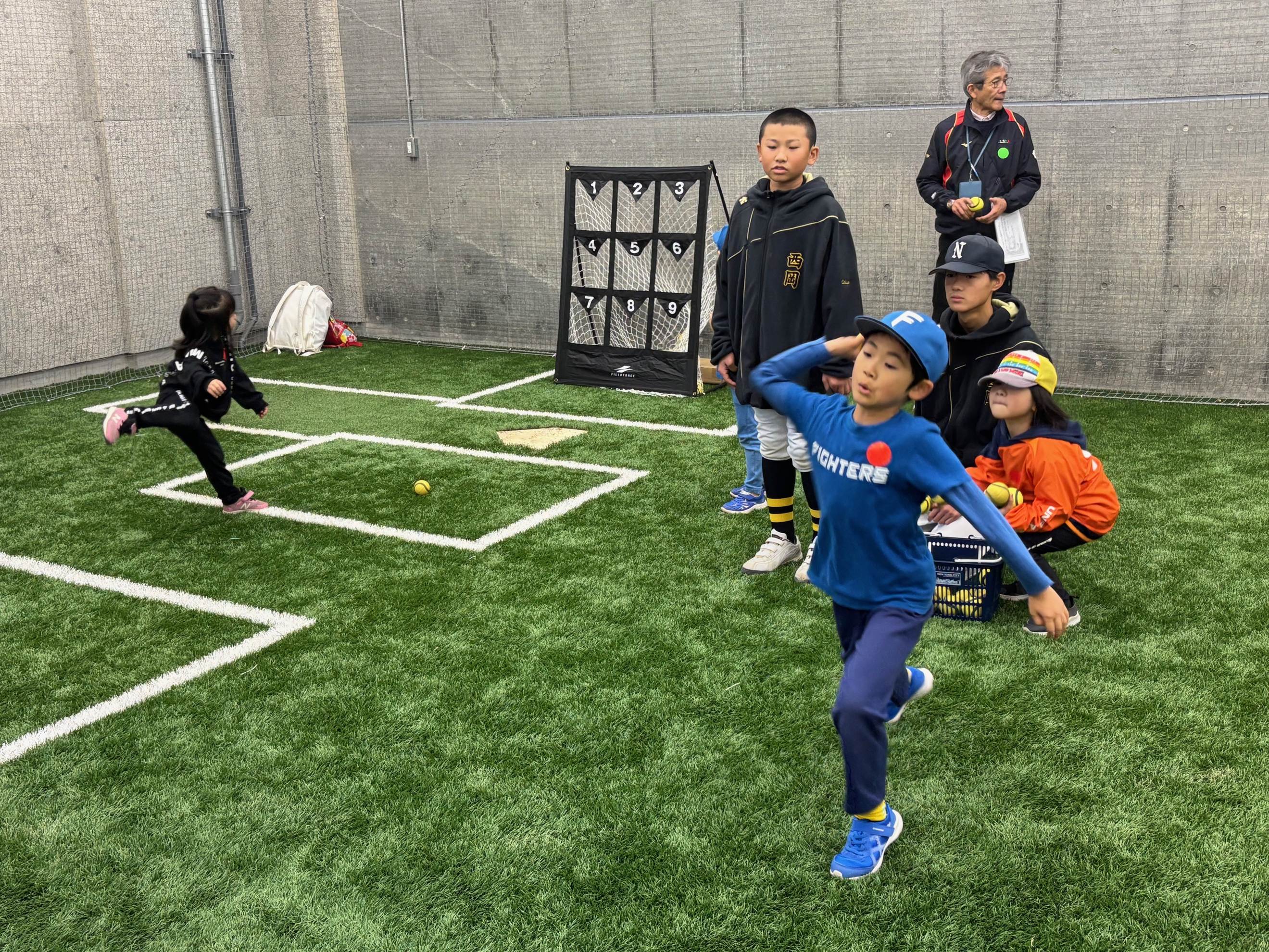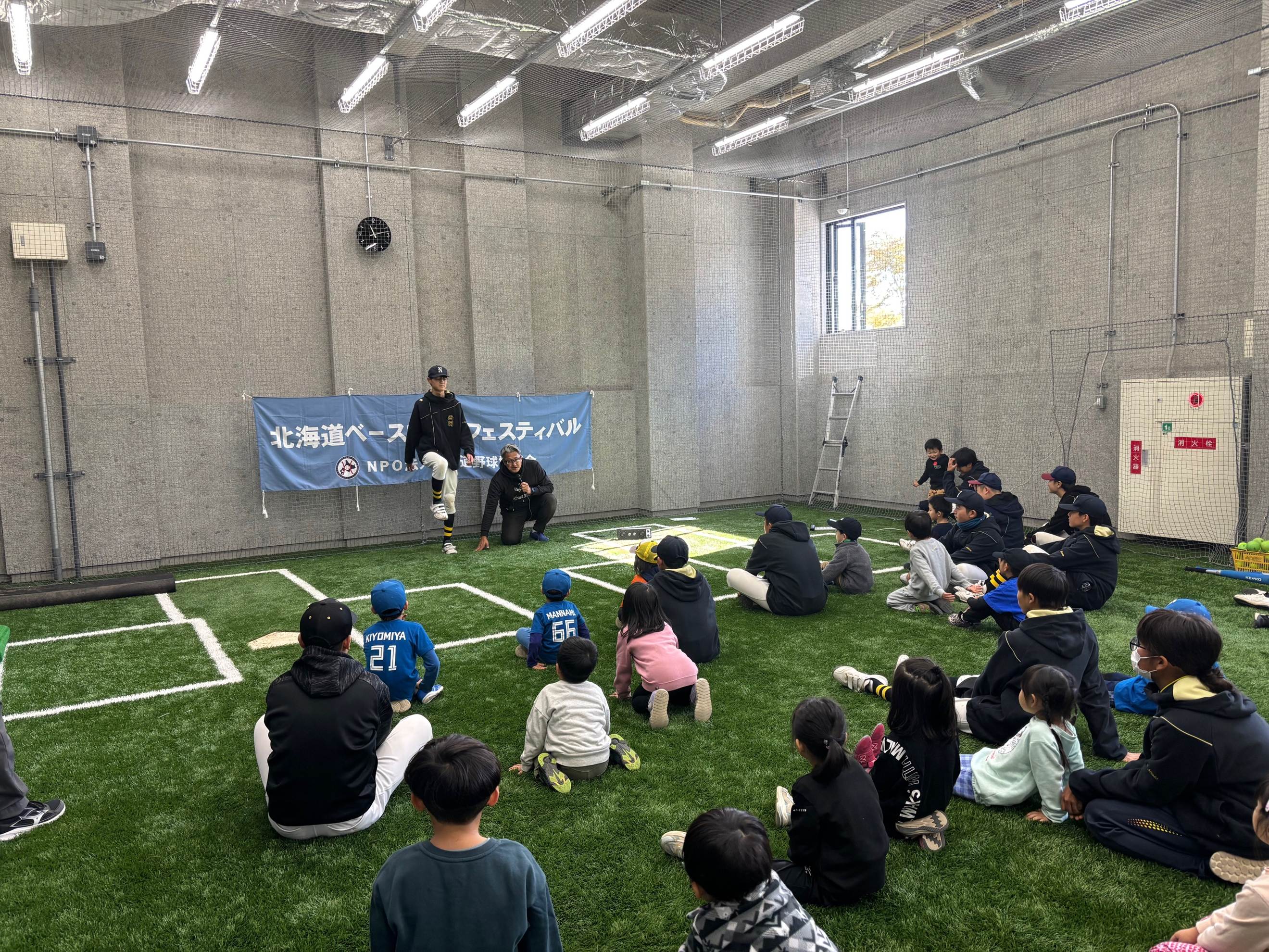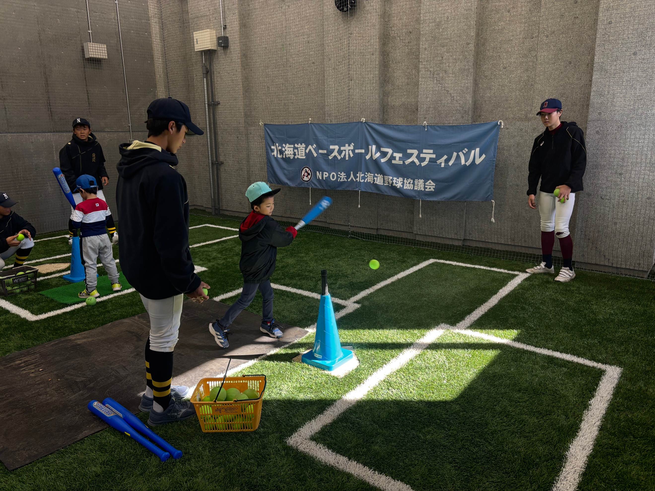 今年春に完成した札幌市モエレ沼公園野球場で、初めて「ベースボールフェスティバル」を開催しました。午前は「キッズフェスタ」に、未就学児、小学校1.2年生25名の子どもたちが参加し、中学の軟式野球2連盟18名の選手・マネージャーがキッズのサポートをしました。あいにく気温が低かったので、新しい室内ブルペン2か所で、ストラックアウト、Tボール打ち、バランス運動のメニューで野球遊びをしました。子どもたちは、中学生のお兄さんお姉さんに相手をしてもらい、笑顔で楽しい時間を過ごしていました。最後はグラウンドに出て、子どもたちはTボールを打った後、ベースランニングでダイヤモンドを一周しホームまで駆け抜けていました。